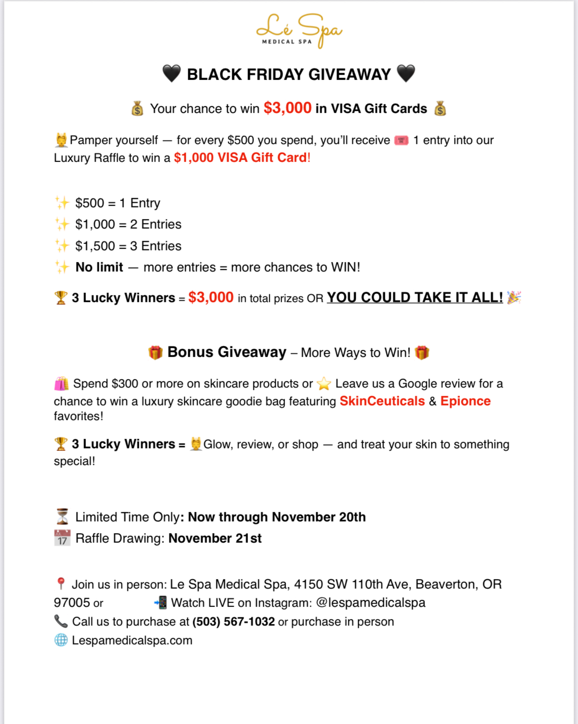 ⦁ You: AN EXTRA 10% OFF either your next treatment or products.